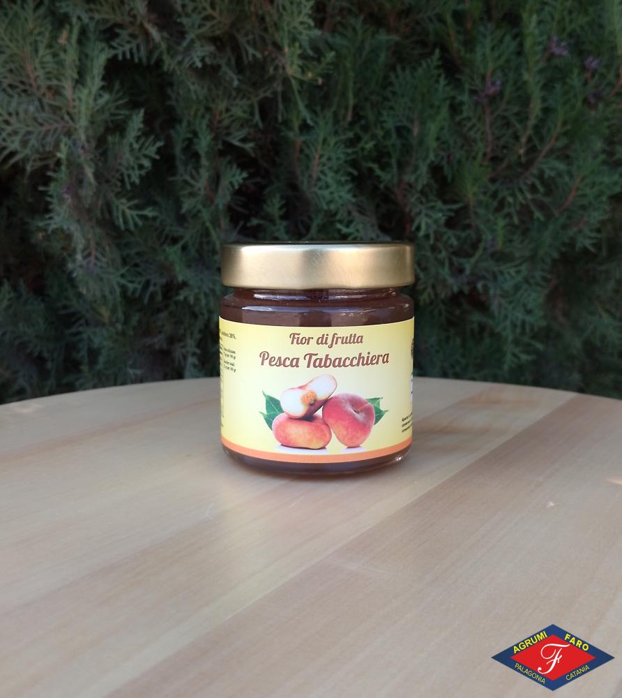 La confettura di pesca tabacchiera è una vera prelibatezza, preparata con una varietà di pesca tipica della zona meridionale d'Italia, particolarmente apprezzata per il suo sapore dolce e aromatico. La pesca tabacchiera, o pesca di Bivona, è un frutto a polpa gialla con una forma schiacciata e una buccia sottile. Il suo gusto è ricco, morbido, e leggermente aromatico, con un tocco che ricorda il miele e una nota delicata di fiori.